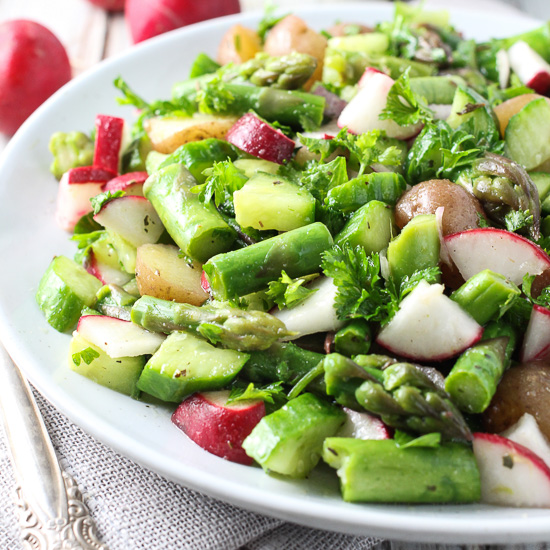 For best results, make sure all the potatoes and asparagus are cooled completely before tossing them with the remaining ingredients. Residual heat can draw too much moisture from the cucumbers and radishes, resulting in a soggy salad.